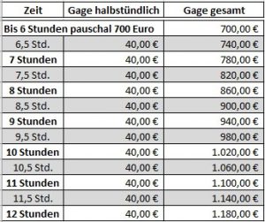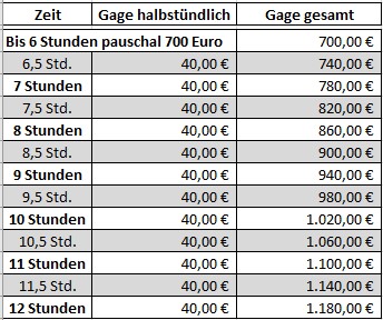 Die Gage für DJ incl. Technik besteht aktuell aus einer 6-stündigen Pauschale und ab 6 Stunden aus einer halbstündigen Preis-Taktung. Sie berechnet sich wie folgt: